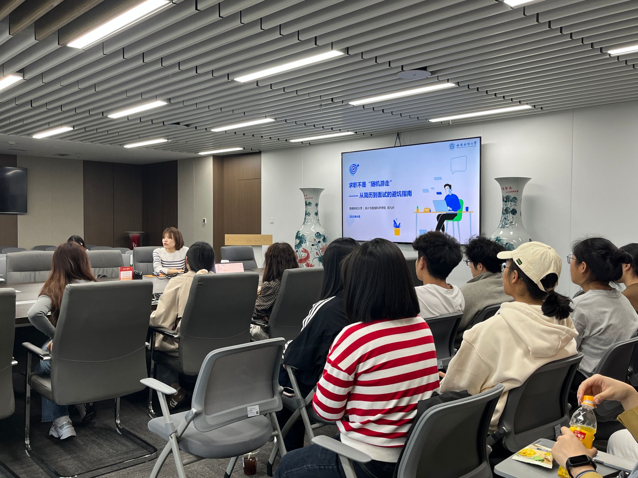 周凡吟教授作为主讲嘉宾。周老师不仅教学经验丰富,还拥有业界开展项目合作的相关经验,对统计领域的最新趋势和岗位需求痛点非常了解。面对当前就业市场内卷的现状,周老师引导同学们跳出“学生思维”,以社会人视角重新理解求职逻辑。她强调,多投简历才能积累更多面试机会,并指导同学们挖掘自身的能力优势。结合统计专业特色,周老师详细拆解了岗位分类与核心需求,重点讲解了简历撰写技巧,强调要将职位描述(JD)中的要求直白地体现在简历中。她还分享了利用AI修改简历、模拟专业面试的方法,并针对同学们普遍存在的“学用脱节”困惑,指导大家如何将专业知识与岗位需求有效结合。